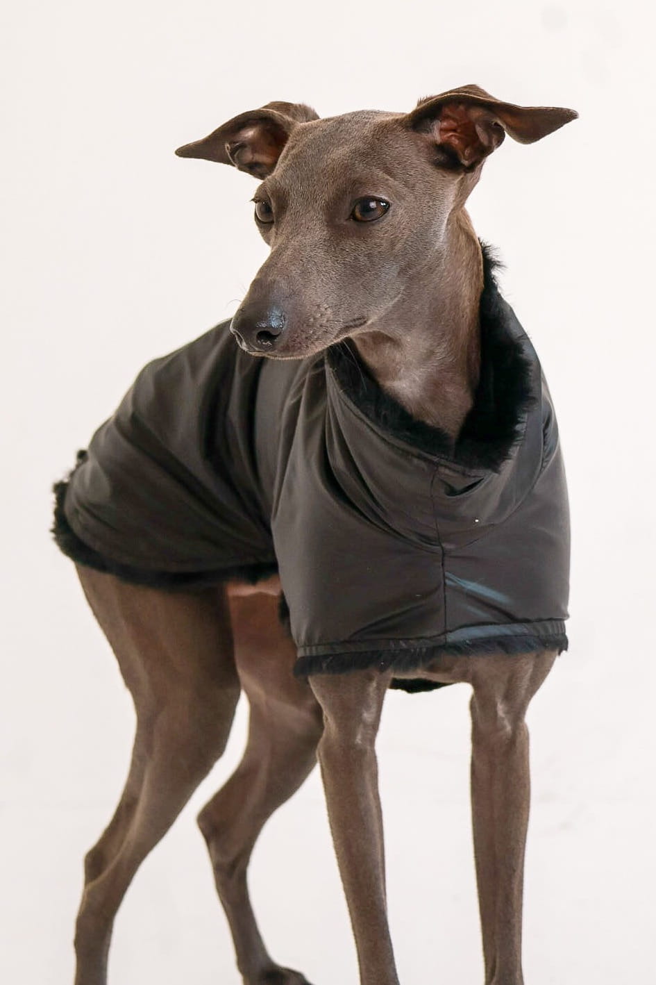 London – płaszczyk dla charta z mikrofazy high-tech z futerkiem w kolorze czarnym